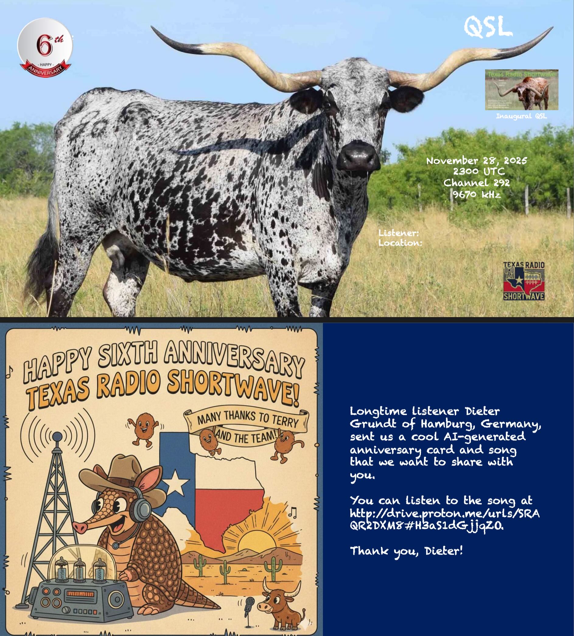 Venerdì 28 novembre ricorre il sesto anniversario di TRSW e abbiamo progettato una speciale QSL per gli ascoltatori che inviano rapporti di ricezione corretti e dettagliati all’ indirizzo texasradioshortwave@protonmail.com.